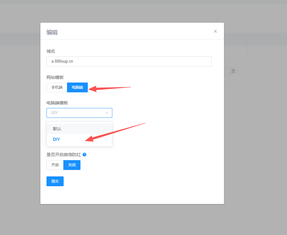 选择电脑端电脑端模板选择DIY 然后点击提交 再次访问你的域名 就可以看到你设计的页
